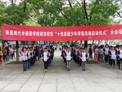 ? 為了響應(yīng)南昌市教育局的號(hào)召,引導(dǎo)未成年人學(xué)習(xí)美德、踐行美德、弘揚(yáng)美德、做一個(gè)有道德的人。鼓勵(lì)他們?yōu)殚L(zhǎng)輩盡孝心,為他人獻(xiàn)愛心,為同學(xué)送關(guān)心。5月2日晨會(huì),南昌現(xiàn)代外國(guó)語(yǔ)學(xué)校(迎賓校區(qū))小學(xué)部全體師生參加了南昌市第三屆“十佳美德少年”評(píng)選活動(dòng)的啟動(dòng)儀式。啟動(dòng)儀式在莊嚴(yán)的國(guó)歌聲中拉開了帷幕。