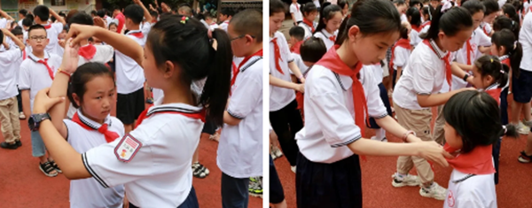 五年級(jí)的哥哥姐姐們鄭重地為新隊(duì)員們佩戴紅領(lǐng)巾,新隊(duì)員們的臉上掛著滿滿的自豪:從今天開始,我就是一名光榮的少先隊(duì)員了!每一個(gè)孩子都顯得那么認(rèn)真而嚴(yán)肅,那么自豪與光榮。鮮艷的紅領(lǐng)巾映著隊(duì)員們朝氣的臉龐,戴上紅領(lǐng)巾,便擁有了一個(gè)響亮的名字——中國(guó)少年先鋒隊(duì)隊(duì)員。戴上紅領(lǐng)巾,意味著小小的肩膀要擔(dān)負(fù)責(zé)任,心系祖國(guó),好好學(xué)習(xí),用行動(dòng)賦予這紅領(lǐng)巾最莊重的內(nèi)涵!