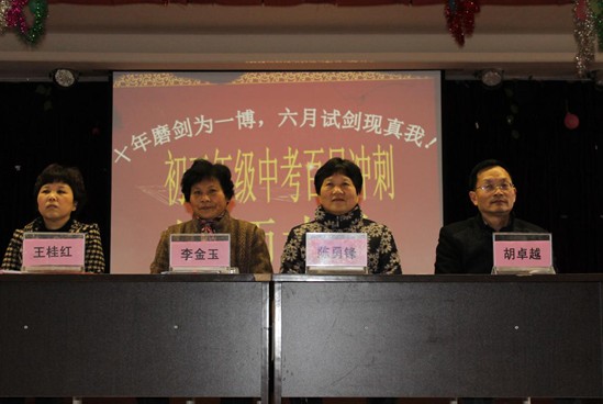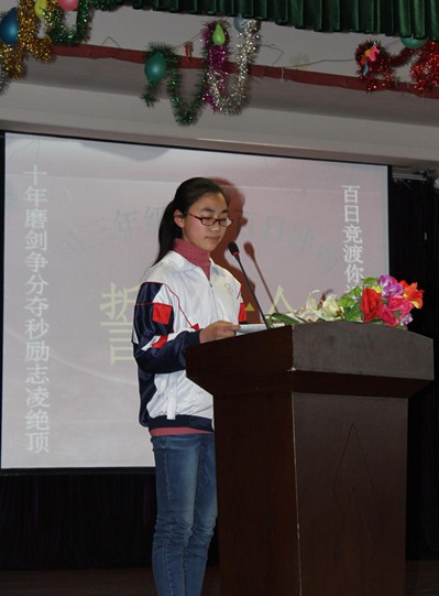 當(dāng)天下午2時(shí)整,誓師大會(huì)正式開始,全體起立,奏唱國(guó)歌。伴隨著嘹亮的國(guó)歌聲響徹云霄,全體師生精神飽滿,愛國(guó)之情油然而生。隨后,學(xué)校校長(zhǎng)李金玉發(fā)表了熱情洋溢的講話,她鼓勵(lì)初三年級(jí)全體師生再接再厲,不負(fù)學(xué)校厚望,對(duì)最后100天的教學(xué)提出了具體要求和指導(dǎo)性意見。緊接著,老師代表上臺(tái)發(fā)言。老師的殷切希望,諄諄教誨又有一次鼓舞了在座的全體學(xué)子。接下來,學(xué)生代表上臺(tái)發(fā)言。學(xué)生代表表示,在最后的100天里,決心集中全部精力打好基礎(chǔ),科學(xué)合理分配時(shí)間,不斷調(diào)整自己的學(xué)習(xí)方法,以百倍的信心戰(zhàn)勝一切困難,勇奪2014年中考佳績(jī),回報(bào)父母的養(yǎng)育之恩,回報(bào)恩師的教導(dǎo)之情,將來成為對(duì)國(guó)家有用之才。同時(shí),會(huì)議特別安排了家長(zhǎng)代表發(fā)言。家長(zhǎng)代表樸實(shí)的話語充滿著對(duì)學(xué)校、孩子們的殷切希望,既有鼓勵(lì),更飽含著期待。
