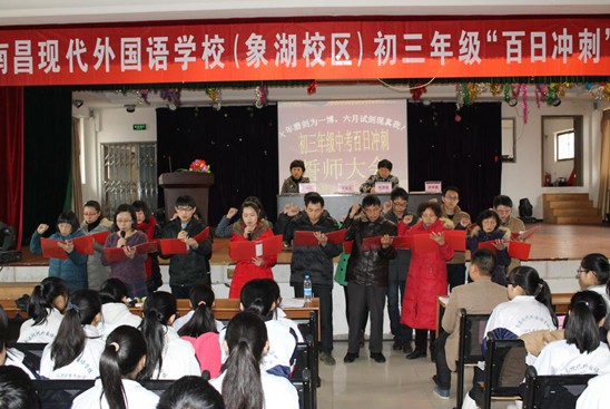 3月7日下午,南昌現(xiàn)代外國(guó)語學(xué)校(象湖校區(qū))初三年級(jí)全體師生和部分家長(zhǎng)代表共600多人,齊聚報(bào)告廳一同向中考百日宣誓。慷慨激昂的誓言,久久在象湖湖畔回蕩。