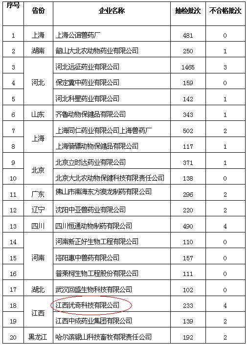 據(jù)悉,這些企業(yè)近年被抽檢次數(shù)超過(guò)百次,抽檢合格率超過(guò)98%,即使抽檢不合格,也少有因產(chǎn)品質(zhì)量的問(wèn)題。產(chǎn)品不確認(rèn)率低于4%。這些企業(yè)為畜牧業(yè)的保駕護(hù)航提供了不可磨滅的貢獻(xiàn)。今后這20家企業(yè)均由中國(guó)醫(yī)藥品檢查所進(jìn)行抽檢,其他任務(wù)承擔(dān)單位只對(duì)其產(chǎn)品進(jìn)行監(jiān)督檢查,不對(duì)其產(chǎn)品進(jìn)行抽樣檢驗(yàn)。