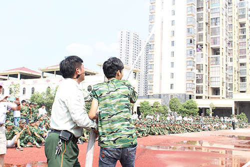 學(xué)院武裝部部長周圣華向2015級(jí)新生就如何報(bào)火警、火災(zāi)的預(yù)防、火場自救及逃生方法等消防安全基本常識(shí)進(jìn)行了講解。周部長現(xiàn)場演示了滅火器的操作程序和消防水帶、消防槍的正確使用方法,同學(xué)們一一上前體驗(yàn)。