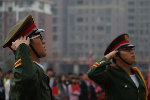 當(dāng)所有運(yùn)動(dòng)員方隊(duì)入場完畢,全場肅立,運(yùn)動(dòng)場上響起激昂的國歌,升旗儀式開始。