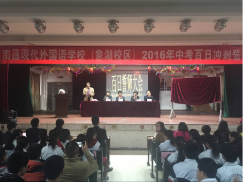 陽(yáng)春三月,春寒料峭,憧憬六月,激情滿(mǎn)懷。為鼓舞初中畢業(yè)班學(xué)生的斗志,讓他們揚(yáng)起自信的風(fēng)帆,信心百倍的迎接中考,2016年3月8日下午,南昌現(xiàn)代外國(guó)語(yǔ)學(xué)校(象湖校區(qū))隆重舉行“2016年中考百日沖刺誓師大會(huì)”,學(xué)校行政領(lǐng)導(dǎo),初三全體教師、同學(xué)及家長(zhǎng)代表500余人參加了這次大會(huì)。