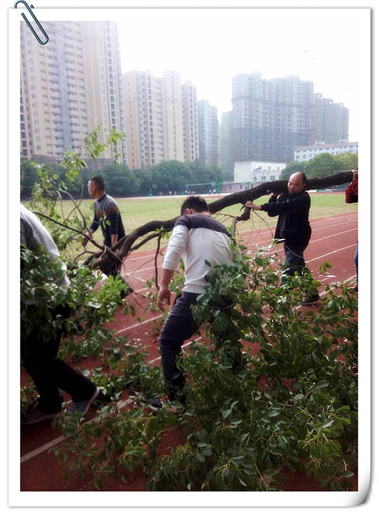 楊端煌校長接到匯報后,立即帶領學??倓战魅?、政教張主任、保衛(wèi)熊科長、校醫(yī)、保安等人趕到現(xiàn)場。做完初步的分工后,不怕臟不怕累,親自動手據(jù)樹、抬樹。經(jīng)過一個下午熱火朝天的修剪與清理,徹底消除了安全隱患,給師生們一個安全整齊的校園環(huán)境。同時,運動場也變得更加寬敞明亮了。
