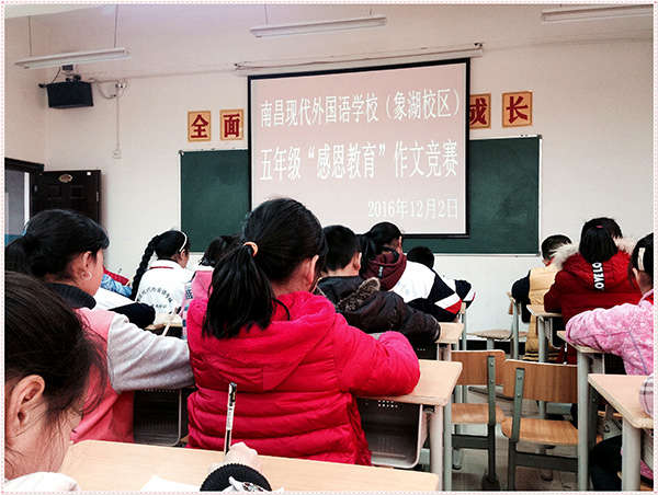 為了全面提高學(xué)生的語文素養(yǎng),豐富校園文化,引領(lǐng)學(xué)生在閱讀、寫作中快樂成長(zhǎng)。2016年12月2日下午,南昌現(xiàn)代外國(guó)語學(xué)校(象湖校區(qū))小學(xué)部開展了“與愛同行 學(xué)會(huì)感恩”為主題的系列教育月征文比賽活動(dòng)。