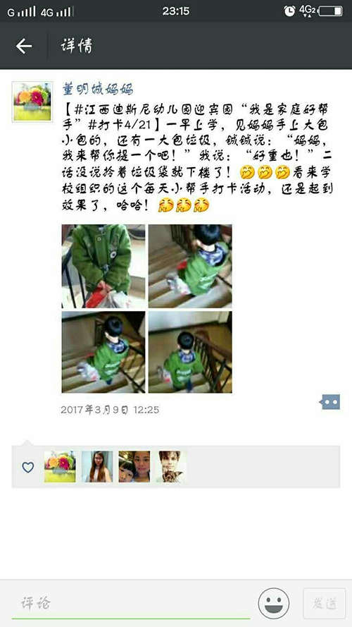 活動一推出,立即獲得了家長們的支持,家長們紛紛積極參與,將與孩子的互動記錄在朋友圈,并發(fā)在班級群內(nèi)與家長們共同交流。此外,幼兒園還為家長們準(zhǔn)備了獎狀,既感謝家長們對幼兒園工作的支持,也感謝家長們?yōu)楹⒆映砷L的付出。