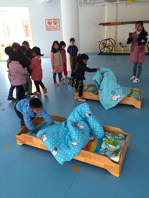 3、大班“疊被子”,幼兒將誰亂的被子折疊擺放整齊。
