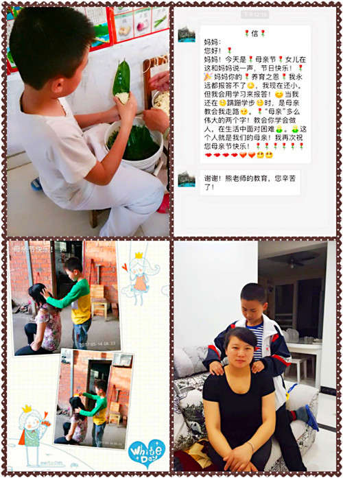 孩子們在學(xué)校的倡導(dǎo)下,紛紛在家里幫助媽媽完成一件力所能及的事情。有的親手為媽媽梳一梳頭發(fā),讓自己的媽媽更年輕漂亮;有的幫媽媽洗碗干家務(wù),讓媽媽有空閑的時間去干自己想做的事情;有的孩子為媽媽捶捶背,解除媽媽一天工作的疲勞;有的孩子精心炒媽媽喜歡吃的各種菜,讓媽媽品嘗孩子為做的美味佳肴;有的孩子為媽媽洗了一次腳,讓媽媽能夠暖暖的入睡;有的孩子為在外打工的母親送去溫馨的祝福語問候;有的孩子為媽媽送去鮮花,祝媽媽節(jié)日快樂……在為媽媽做一件貼心事的同時,孩子們也沒忘記心愛的老師,紛紛給女老師們送上祝福和問候,個別同學(xué)還為女老師送上了精美的卡片,感謝老師們的傾情付出。