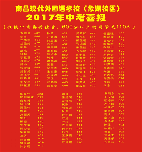 桃李爭榮,再創(chuàng)新高;高歌七月,喜著華章。在市區(qū)政府及教育局領導的親切關懷下,在集團領導和社會各界朋友的傾心支持下,在學校領導班子的勤勉引領下,在全體師生員工的奮發(fā)努力下,南昌現(xiàn)代外國語學校象湖校區(qū)秉承“以質(zhì)量求生存,以優(yōu)質(zhì)求發(fā)展;給學生以成就感,讓教師有責任感,讓家長有信任感”的辦學理念,在家長們的緊密配合與支持下,以及老師們勤勤懇懇工作,任勞任怨的付出,默默無聞的奉獻,教育質(zhì)量穩(wěn)步提高,2017年中考全面告捷,喜報頻傳。今年中考600分以上的學生110人,目前,被江西省一類重點中學錄取的學生有133人,其中,萬新晨同學以689分的好成績名列前茅;彭可依、梅文莉同學喜獲中考政治滿分。