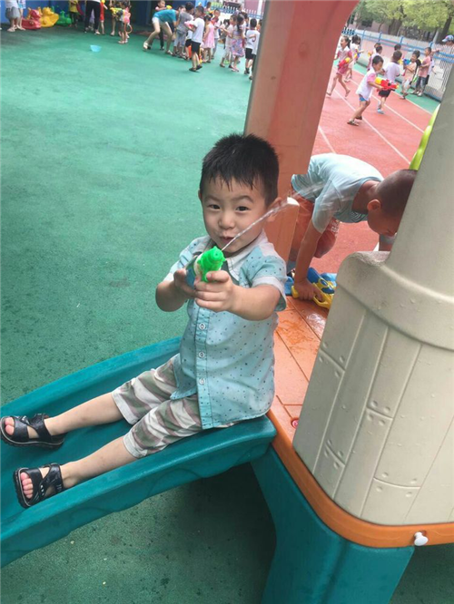 活動(dòng)中,每個(gè)孩子做了充分準(zhǔn)備,有雨衣、雨靴、備用衣物,最吸引眼球的還屬威力不同的水槍裝備,有大小不同的水槍、各種卡通造型的水槍、“噴霧器式”水槍等。在活動(dòng)中,有的班級(jí)的孩子打起了“保衛(wèi)戰(zhàn)”,“開戰(zhàn)!”老師一聲令下,孩子們互相噴射起來,個(gè)個(gè)都神勇無比,不甘示弱。孩子們充分體驗(yàn)了玩水槍的快樂,此時(shí),幼兒園變成了歡樂的海洋。在水槍大戰(zhàn)中老師加入到孩子們的隊(duì)伍中,像做戰(zhàn)指揮官一樣率領(lǐng)著小朋友們盡情地開展玩水游戲,尖叫聲、歡笑聲、吶喊聲,此起彼伏,幼兒園頓時(shí)沸騰起來,變成了一片歡樂的海洋。