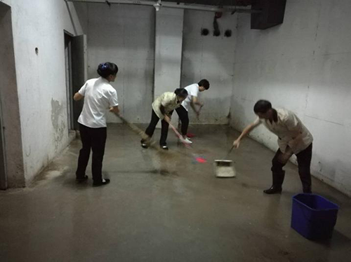 1、哪里需要到哪里,你看,保潔員、秩序員、客服員,還有品質(zhì)部經(jīng)理正在對積水進(jìn)行清掃。