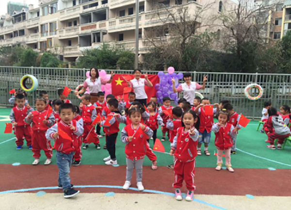 首先,活動的第一個環(huán)節(jié)——升國旗奏國歌,音樂響起時四名護旗手一只手護著國旗一手敬禮向升旗臺緩緩走來,當國歌響起,迪斯尼象湖園全體師生齊唱國歌行注目禮,目送國旗冉冉升起!音樂停止,禮畢!