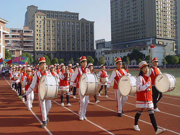 在激昂的《運(yùn)動(dòng)員進(jìn)行曲》音樂聲中,隆重而熱烈的開幕儀式拉開帷幕。青春的腳步,快如金秋之風(fēng);綻放的笑容,燦若春曉之花。國(guó)旗隊(duì)、會(huì)徽隊(duì)、彩旗隊(duì)、鼓號(hào)隊(duì)首先入場(chǎng),場(chǎng)面壯觀,氣勢(shì)恢宏。在儀仗隊(duì)的引領(lǐng)下,70個(gè)班運(yùn)動(dòng)員方陣昂首步入會(huì)場(chǎng),嘹亮的口號(hào)彰顯出同學(xué)們飽滿的狀態(tài)和高昂的斗志。新穎出彩的口號(hào)標(biāo)語(yǔ)、創(chuàng)意十足的才藝展示、精致巧思的造型道具……無(wú)不透露著現(xiàn)外學(xué)子意氣風(fēng)發(fā)、昂揚(yáng)向上的良好精神風(fēng)貌。接著,進(jìn)行3—8年級(jí)學(xué)生廣播體操比賽,隨著悠揚(yáng)的音樂響起,同學(xué)們神采飛揚(yáng),一雙雙小手在空中劃出優(yōu)美的弧度,一張張笑臉洋溢著濃濃的青春活力,展現(xiàn)了學(xué)生陽(yáng)光可愛,健康向上的精神面貌。