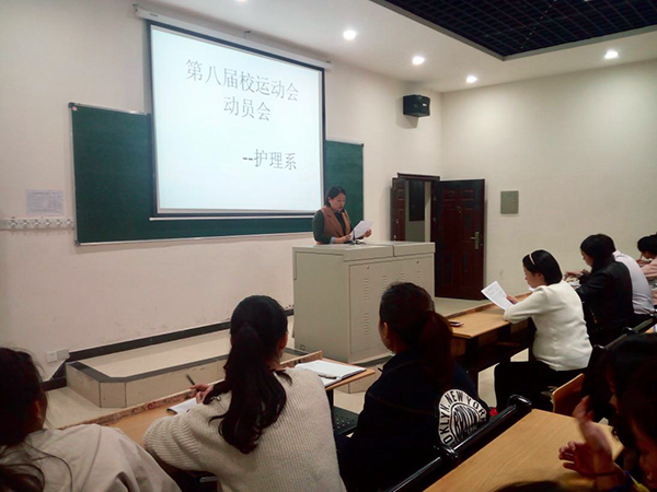宋琴老師代表系部講解了《2017年秋季運動會運動員比賽注意事項》,提醒和要求運動員從賽前、賽中、賽后的三個方面指出注意事項,做好有關(guān)比賽準(zhǔn)備。周煒鑫老師宣讀了《護理系參加第八屆校運會應(yīng)急預(yù)案》,從組織機構(gòu)、基本要求、突發(fā)事件處置三個方面做了具體要求。胡鑫鑫老師介紹了第八屆校運會的開幕式議程及比賽日程安排。尹國華書記在動員會上,對方陣入場、團體表演、賽事組織、文明觀賽等工作做了部署,希望全系各班級運動員在第八屆運動會上賽出風(fēng)格,賽出水平,贏得榮譽,為個人和集體爭光。
