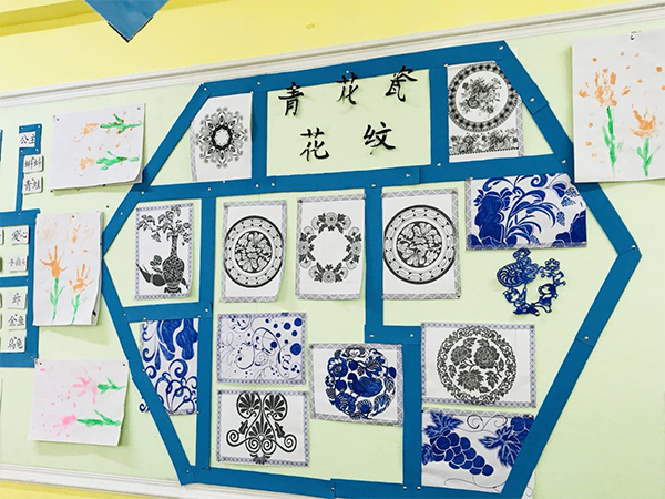 學(xué)期前,江西迪斯尼幼兒園·金沙園就以中國傳統(tǒng)文化作為環(huán)境創(chuàng)設(shè)的主題,比如我園樓道墻體懸掛或張貼了各式各樣的戲曲臉譜、文化扇、剪紙、國畫等;樓道吊飾則裝飾成了中華瓷器的造型,小主題命名為《中華瓷韻》;展覽架一般做成博古架的造型,擺放一些以石頭、瓶子、粘土為載體的中國元素的裝飾。吊飾以中國戲曲,中國瓷藝,中國剪紙,中國扇藝,十二生肖,四大發(fā)明,二十四節(jié)氣,二十四孝、成語故事繪圖等作為題材。這些裝飾首先從視覺上給人以濃重的中國味,使幼兒置身于中國元素的氛圍中,潛移默化的體驗中華文化的豐厚與博大,感受中華文明的大氣與典雅。