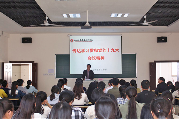 10月30日,江西工商職業(yè)技術(shù)學(xué)院召開黨委擴(kuò)大會(huì)議,組織全院中層以上干部及部分黨員代表傳達(dá)學(xué)習(xí)貫徹了十九大精神。會(huì)議由黨委書記周瑾主持,院長(zhǎng)劉明初、副院長(zhǎng)傅江海、陳偉高、曠強(qiáng)軍、胡國(guó)輝出席,中層干部及部分黨員代表參加。