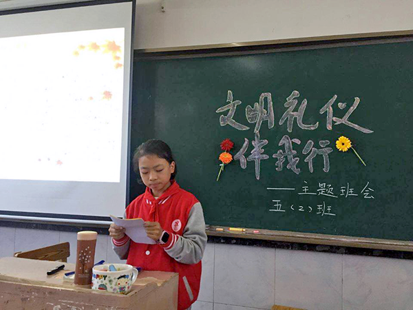 南昌現代外國語學校迎賓校區(qū)小學部11月份開展了《文明禮儀伴我行》主題系列教育活動。11月29日下午各班利用班隊會開展形式多樣的主題教育活動。有的班開展詩歌朗誦、有的班進行了演講比賽等。