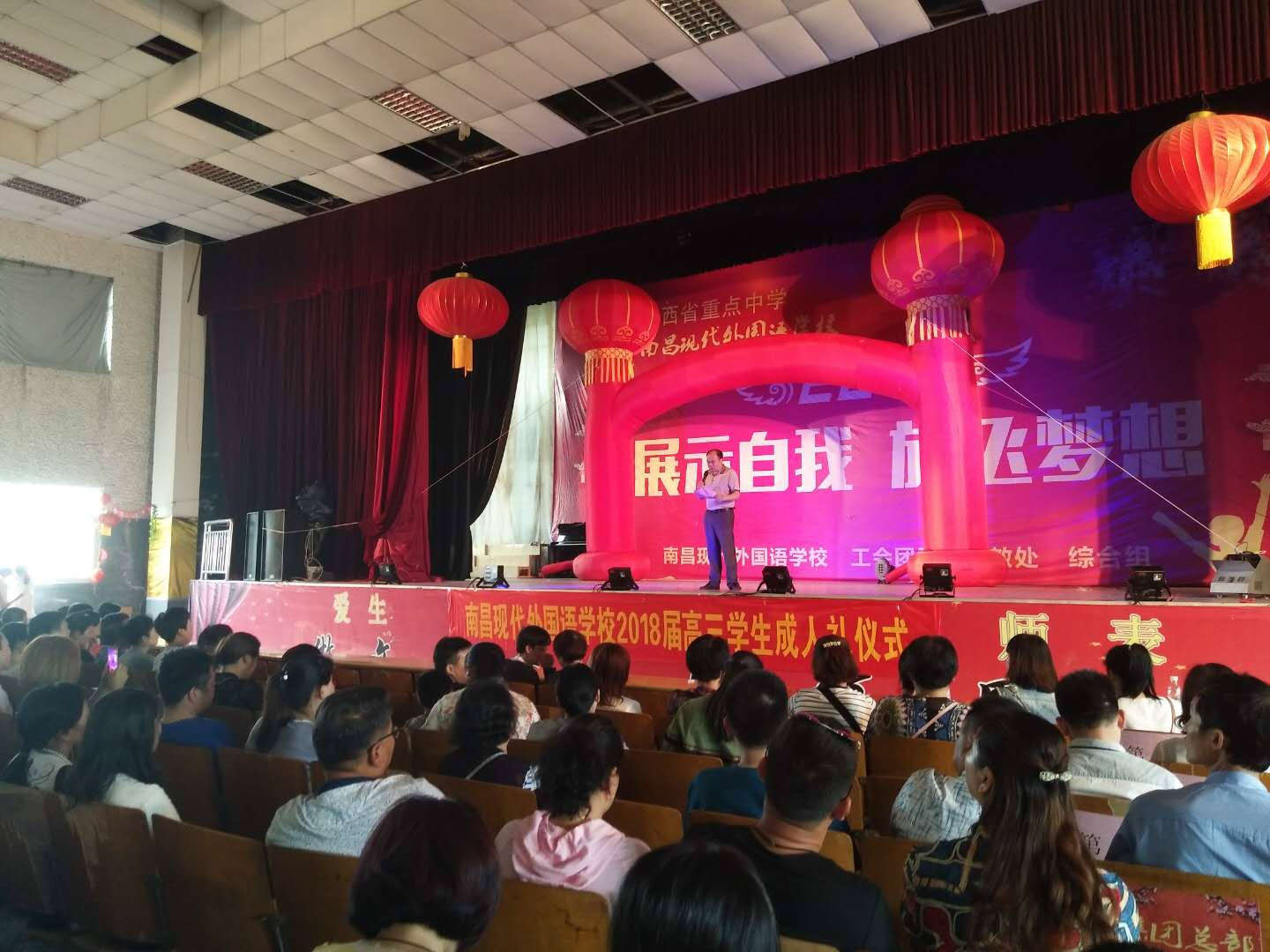 以“青春勇?lián)厝危?zé)任成就夢(mèng)想”為主題的南昌現(xiàn)代外國(guó)語(yǔ)學(xué)校2018屆成人禮活動(dòng),5月14日下午2:30在學(xué)校演播大廳隆重舉行。高三全體師生及家長(zhǎng)齊聚學(xué)校演播大廳,迎接這神圣的一刻。學(xué)校楊端煌校長(zhǎng)、小學(xué)部涂玉萍校長(zhǎng)、高中部王文群主任、高三年級(jí)組