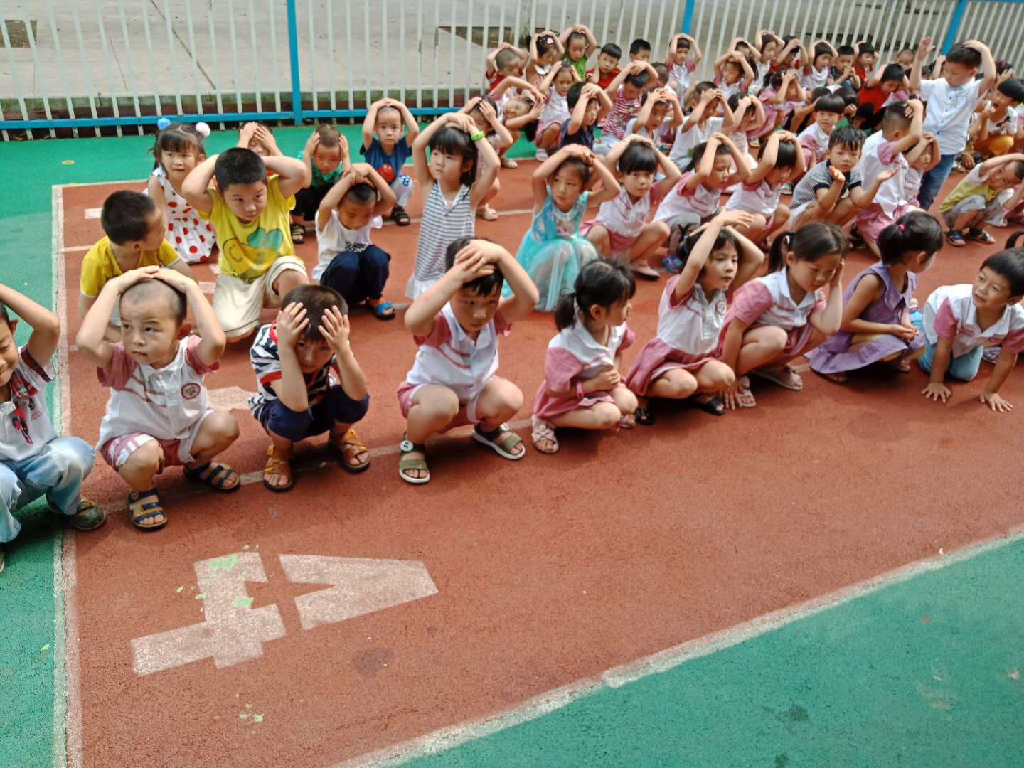 一分鐘后,信號(hào)員解除警報(bào),各班教師組織幼兒用手或其他物品保護(hù)頭部,迅速有序地分別從各個(gè)安全通道緊急疏散到室外安全空曠的場(chǎng)地(一樓操場(chǎng))。