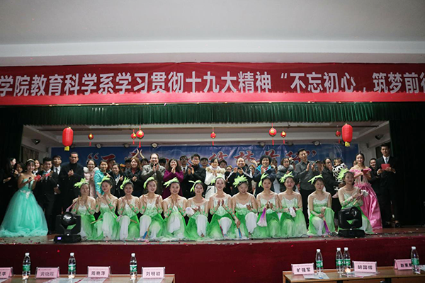 晚會在開場歌舞《一帶一路》中拉開帷幕。高昂的旋律、歡快的舞步,表達出了教育科學系對黨的十九大勝利召開的喜悅;同時為了促進我系文藝氣息更加濃厚,師生共舞讓晚會變得更加的富有氣息,也促進了晚會有序進行。李曉峰老師的一首《悟空》把晚會推上了高潮,其中蘊含的堅持不懈的拼搏精神賦予廣大師生前行的力量,在今后的日子里貫徹黨的十九大精神,不忘初心,打造特色教科文化。一支氣勢磅礴的《共圓中國夢》為晚會畫上一個完美的句號,讓我們跟隨著十九大的足跡,在新的一年繼續(xù)譜寫教科的輝煌,用愛與行動共創(chuàng)工商夢。