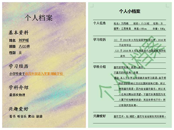 此次參賽作品的文字內(nèi)容包含四方面:一、基本信息;二、學(xué)科介紹;三、興趣愛好;四、自我評價。同學(xué)們以自己為主,發(fā)揮想象,根據(jù)自己的興趣愛好,自由創(chuàng)作。