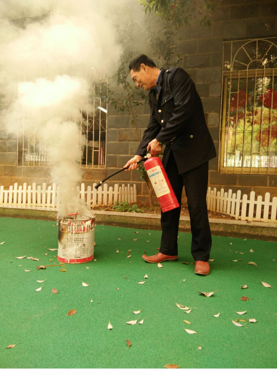 樓下的門衛(wèi)爺爺也拿了干樹葉點燃、模擬著火,并使用滅火器教小朋友和老師們如何滅火。回到班上后,老師們也都跟小朋友上了相對應的課程,教育幼兒遇到著火時該如何自救。