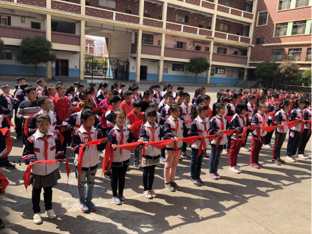 儀式上,歌聲嘹亮,隊旗、紅領巾格外鮮艷,五年級的老隊員為123名新隊員佩戴了紅領巾。隨后,輔導員帶領新隊員在隊旗下莊嚴宣誓,并為同學們送上了寄語:“戴上紅領巾,就增添了一份自豪,也多了一份責任。你們要從小做起,一點一滴積累,成為一個好思想、好品德的少先隊員!”在鮮艷的隊旗下,新隊員們高舉右手,一起跟著大隊輔導員莊嚴宣誓,那稚嫩的童聲,回蕩在現(xiàn)外象湖上空,宣告一個嶄新的童年已經(jīng)吹響號角……