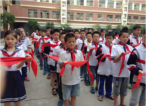 六年級隊員準備為新隊員佩戴紅領(lǐng)巾