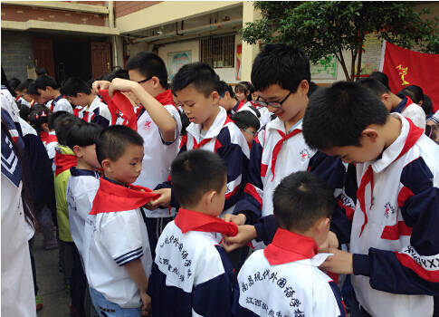 六年級隊員為新隊員佩戴紅領(lǐng)巾